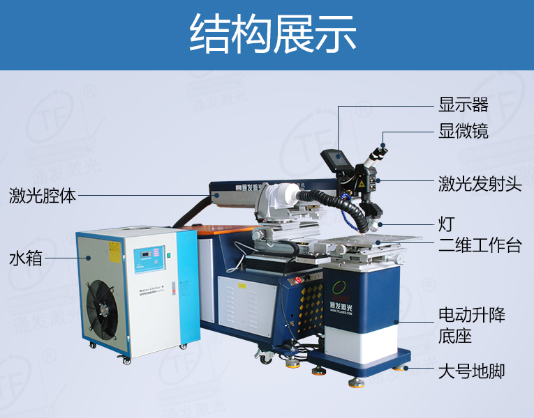 出口型模具激光焊機是通發(fā)激光公司專門為出口國外客戶使用而設(shè)計的系列機型TFL-200E,適用于各類精密注塑模具、壓鑄模具等模具激光修補焊接;同時也適合鑄件沙孔激光修補、模具崩缺激光修復(fù)、過切加工等的激光修補;各類金屬結(jié)構(gòu)件、金銀首飾的激光焊接加工。